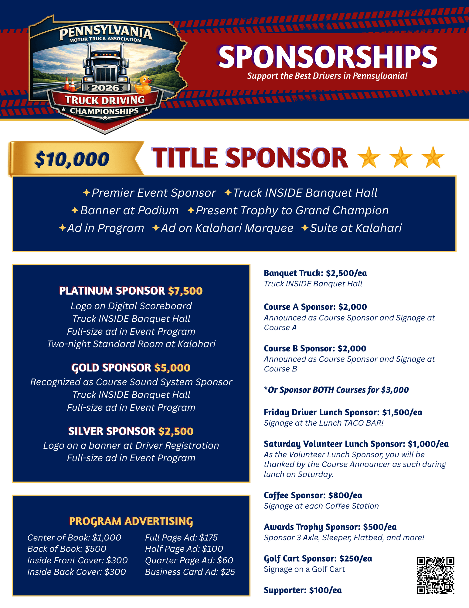 By supporting the Championships, sponsors demonstrate a public commitment to highway safety and the professional drivers who keep Pennsylvania moving, while positioning their company in front of a highly targeted and respected audience within the trucking community.