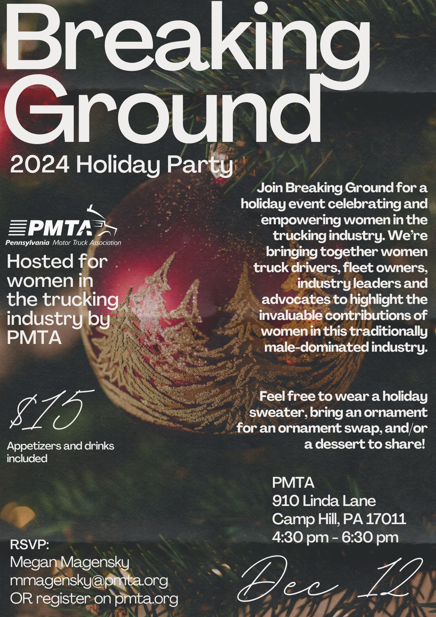 Join PMTA's Breaking Ground for a holiday event celebrating and empowering women in the trucking industry. We’re bringing together women truck drivers, fleet owners, industry leaders and advocates to highlight the invaluable contributions of women in this traditionally male-dominated industry.
