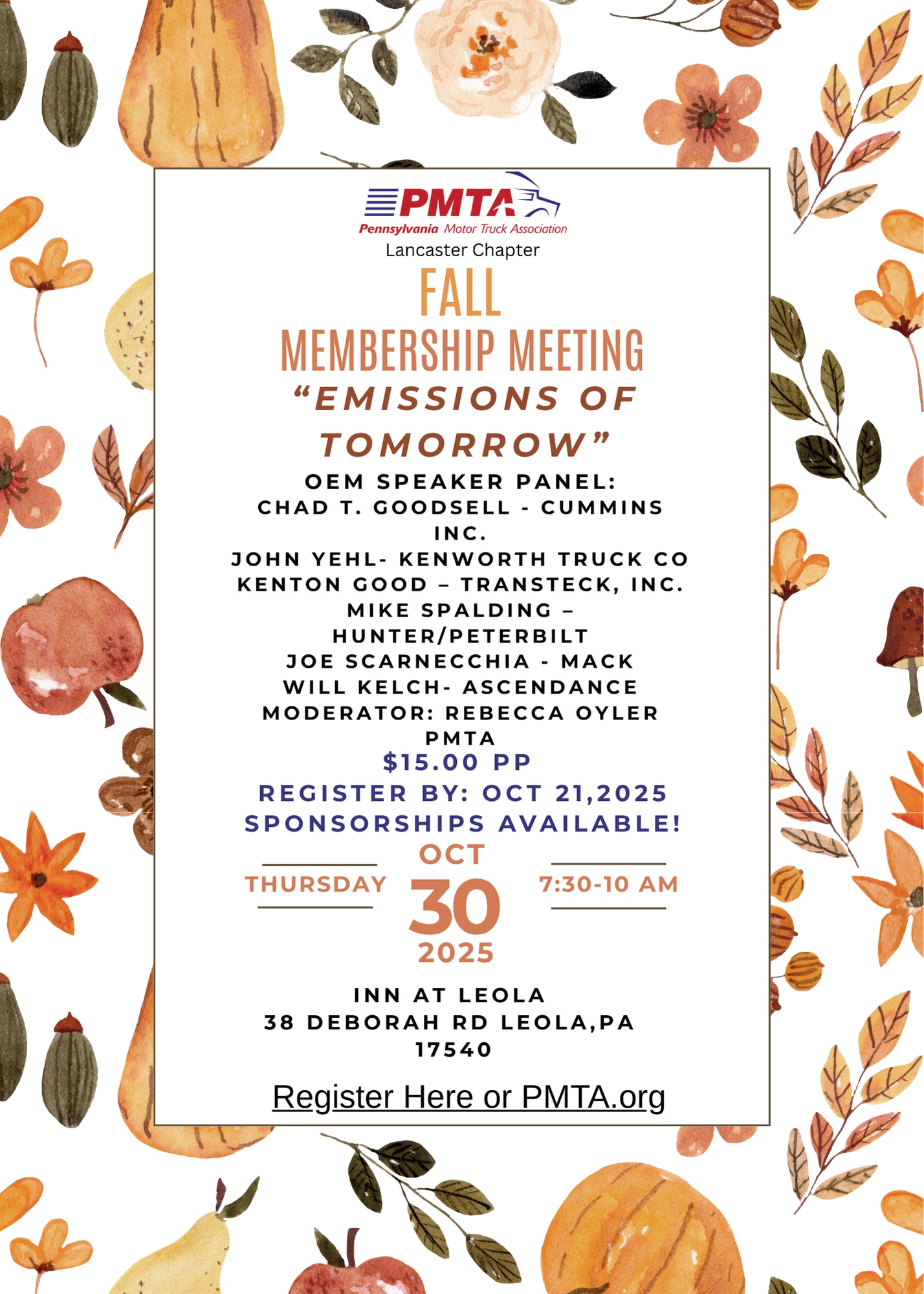 Join the Pennsylvania Motor Truck Association (PMTA) Lancaster Chapter for our 2025 Fall Membership Meeting, focusing on the future of emissions in the trucking industry.