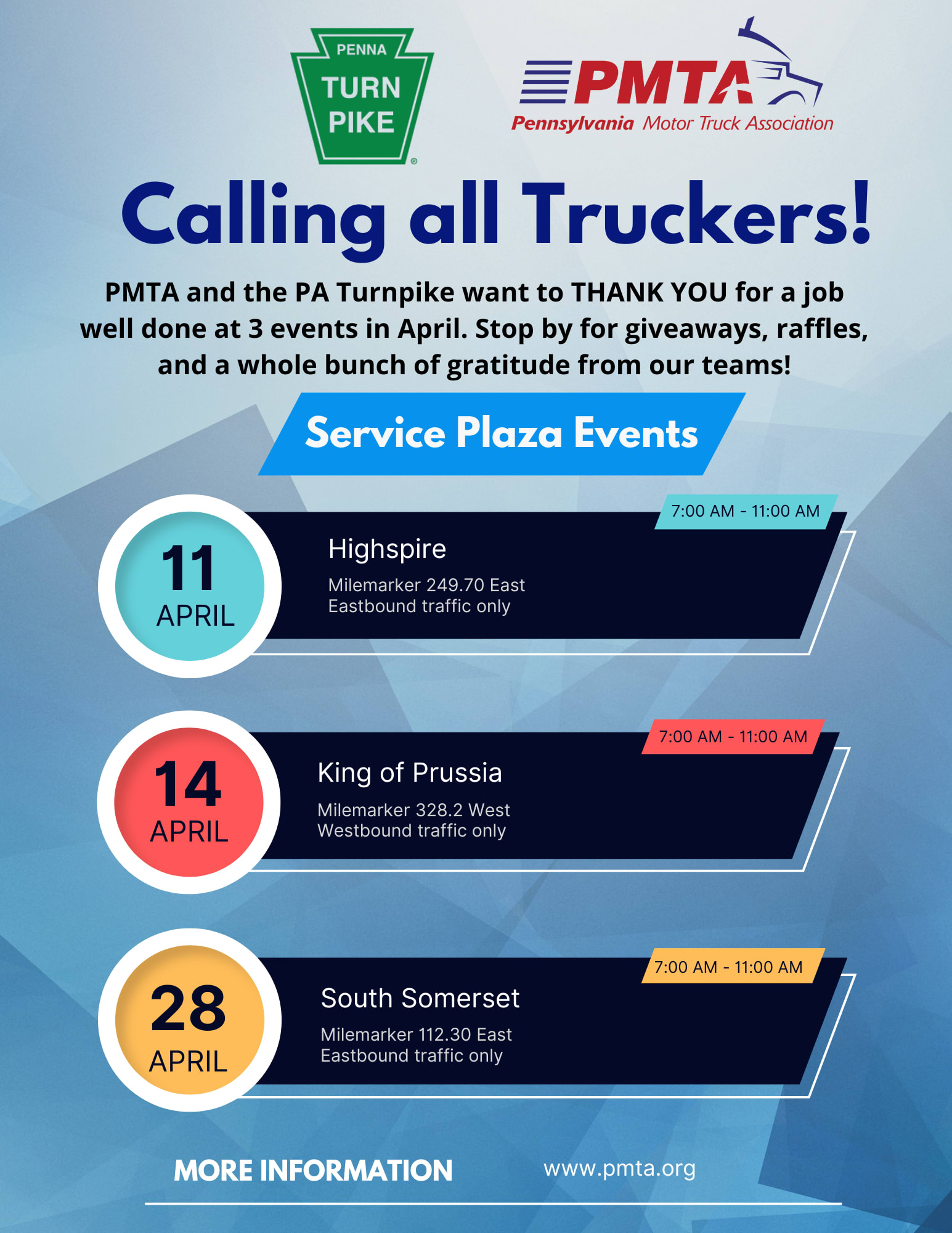 The Pennsylvania Motor Truck Association (PMTA) is teaming up with the Pennsylvania Turnpike Commission (PA Turnpike) to offer a series of April events to show truck driver appreciation! PMTA and the PA Turnpike will be handing out give aways and other freebies to truck drivers at a series of PA Turnpike service plazas on April 14th in King of Prussia, and April 28th in South Somerset, all from 7-11 AM. The PA Road Team will also be at these events to promote Safety.Images