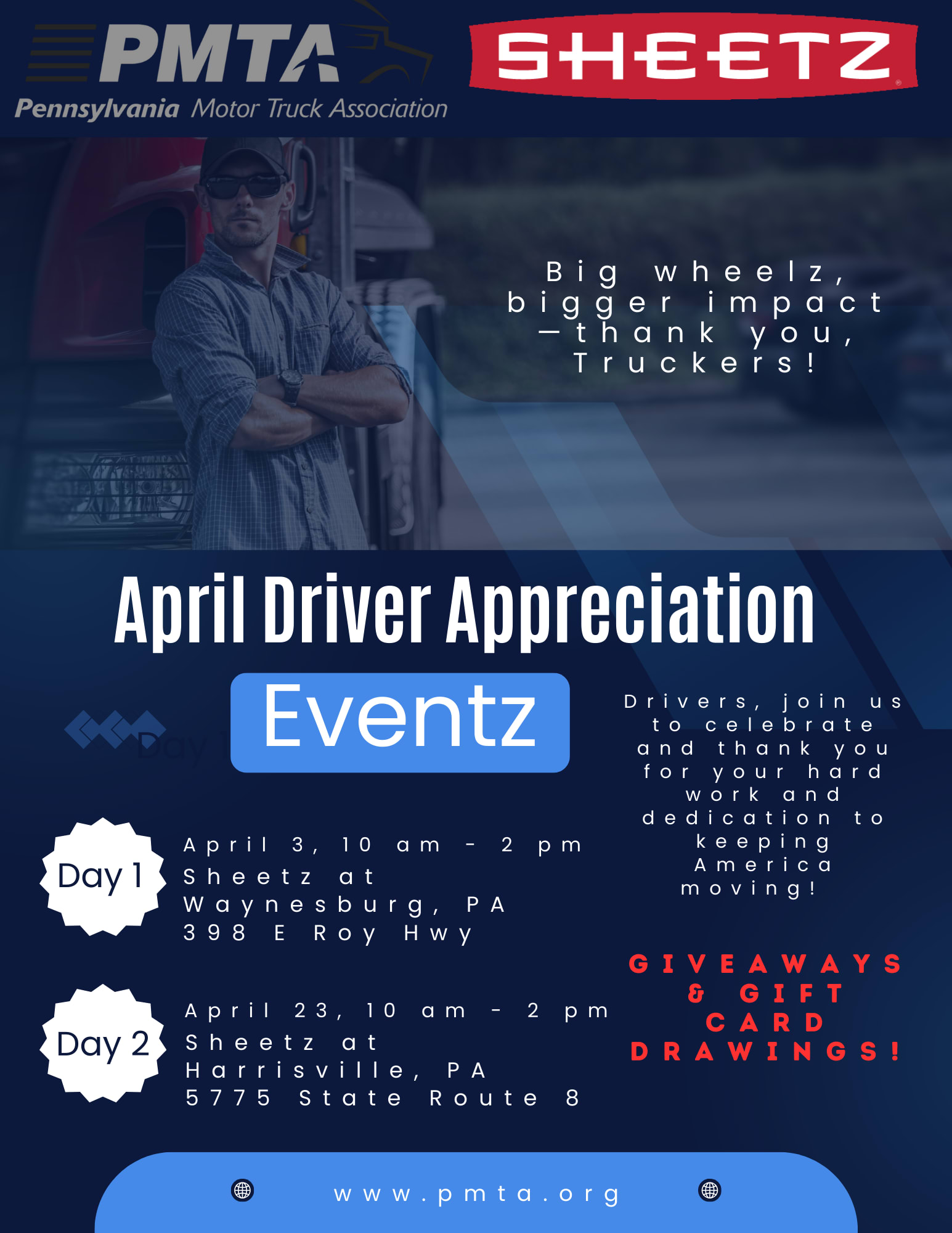 The Pennsylvania Motor Truck Association (PMTA) is teaming up with Sheetz on April 23rd, 10:00 am -2:00 pm, to thank Truck Drivers! There is a $100 Sheetz gift card raffle, also PMTA and Sheetz will be giving away hats, MTO coupons, and other freebies to truck drivers at Sheetz Barkeyville, 5775 State Route 8, Harrisville, PA 16038 (Barkeyville).Images