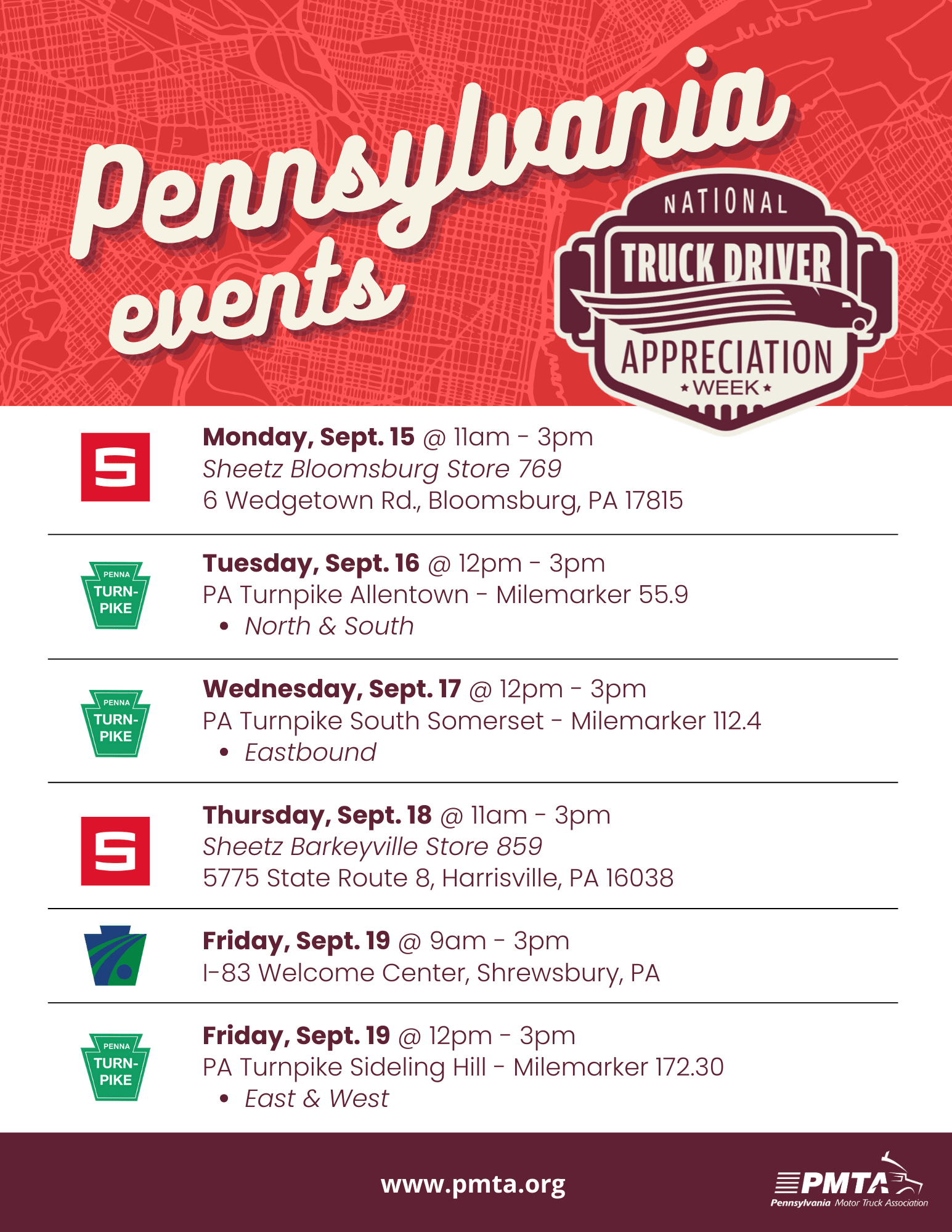 The Pennsylvania Motor Truck Association (PMTA) is teaming up with the Pennsylvania Turnpike Commission (PA Turnpike) and Pennsylvania Department of Transportation (PennDOT) and Sheetz to offer a series of events for truck drivers in honor of National Truck Driver Appreciation Week, which runs from September 14, 2025, to September 20, 2025.