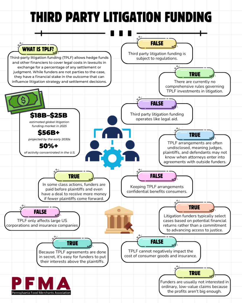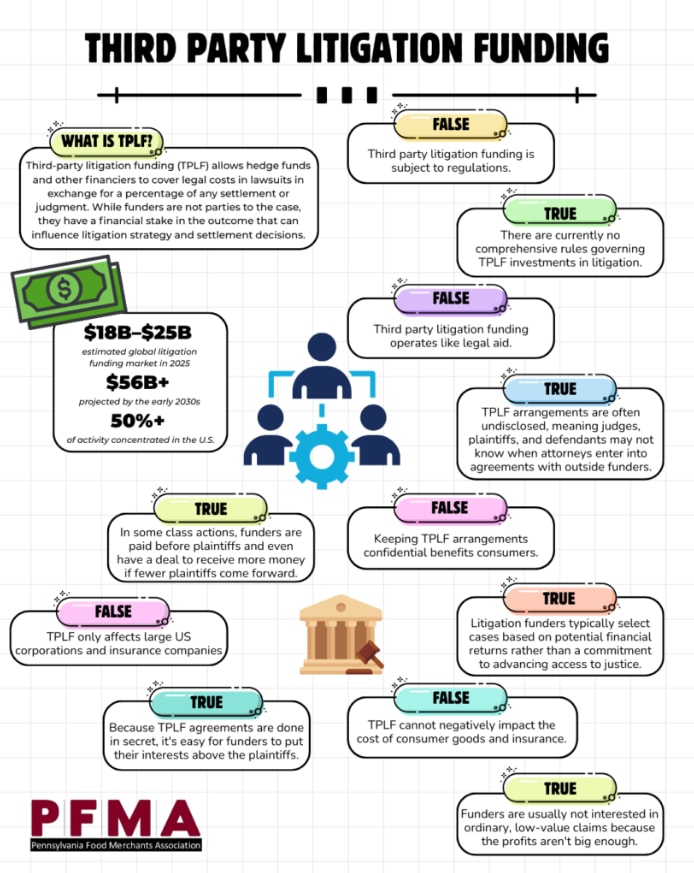 The following article is shared with permission from our colleagues at the Pennsylvania Food Merchants Association (PFMA). While it focuses on food merchants, the challenges it describes are also hitting Pennsylvania’s trucking industry hard. Motor carriers—like many other essential industries—are facing sharply rising insurance costs driven by nuclear verdicts, inflated settlements, and the growing role of third-party litigation funding (TPLF), where outside investors finance lawsuits in exchange for a share of the payout. These practices are distorting the civil justice system, driving up costs for businesses, and ultimately increasing prices for consumers. The trucking industry and other sectors that keep our economy moving have a shared interest in bringing greater transparency and balance to the litigation environment.