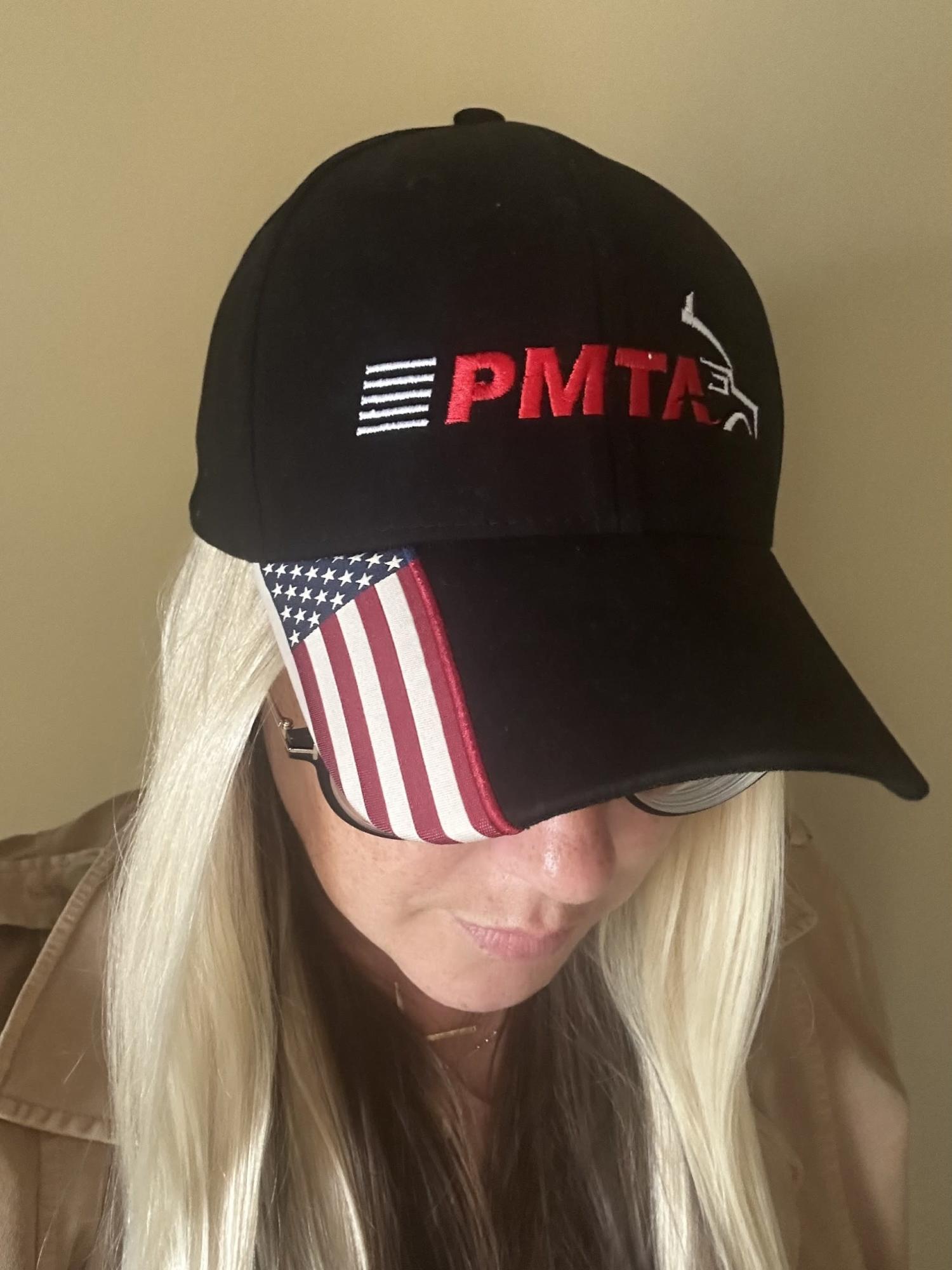 Black baseball hat with Velcro adjustment strap. American flag embroidered on right side of bill, red and white embroidered PMTA logo on the front on the hat, and red embroidered Pennsylvania Motor Truck Association on the back of the hat.